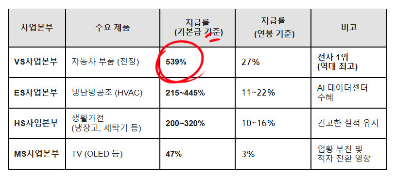 1. 전장(VS)의 독주: 이젠 LG전자의 핵심, 전장 사업본부가 기본급의 539%를 받으면서 전사 최고치를 찍었다.